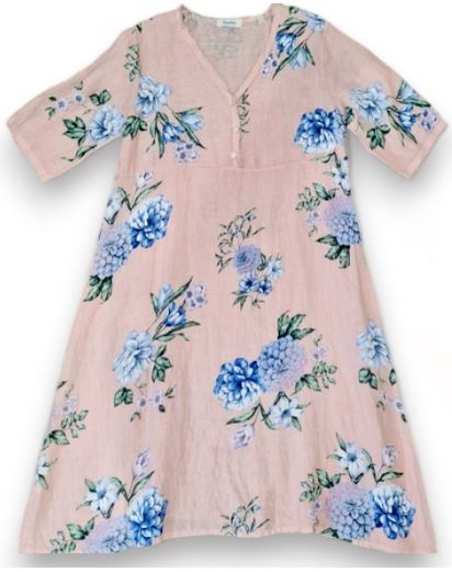 Baby Pink Bloom Button V-neck Maxi DressFree Sized, Colour: Baby PinkComposition: 100% Linen-Made in Italy*Linen garments are hand dyed & printed. Imperfections may occur and is expected as part of the look* Comfortable over-sized style in a v-neck shape, great layering dress for the season.