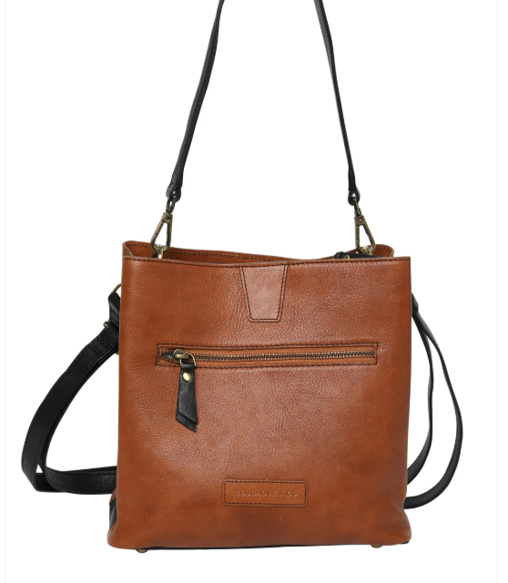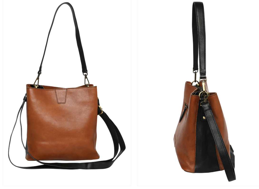Detachable shoulder strap and cross body long strap, metal feet, two outside sections and center zip section.