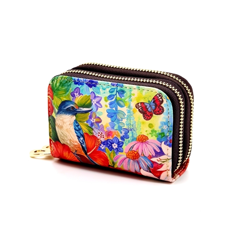 Leather double zipped card holder is printed on Wild Flowers & Kingfisher Birds artwork by NZ local artist Irina Velman