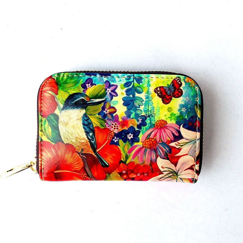 Leather card holder is printed on Wild Flowers & Kingfisher Birds artwork by NZ local artist Irina Velman