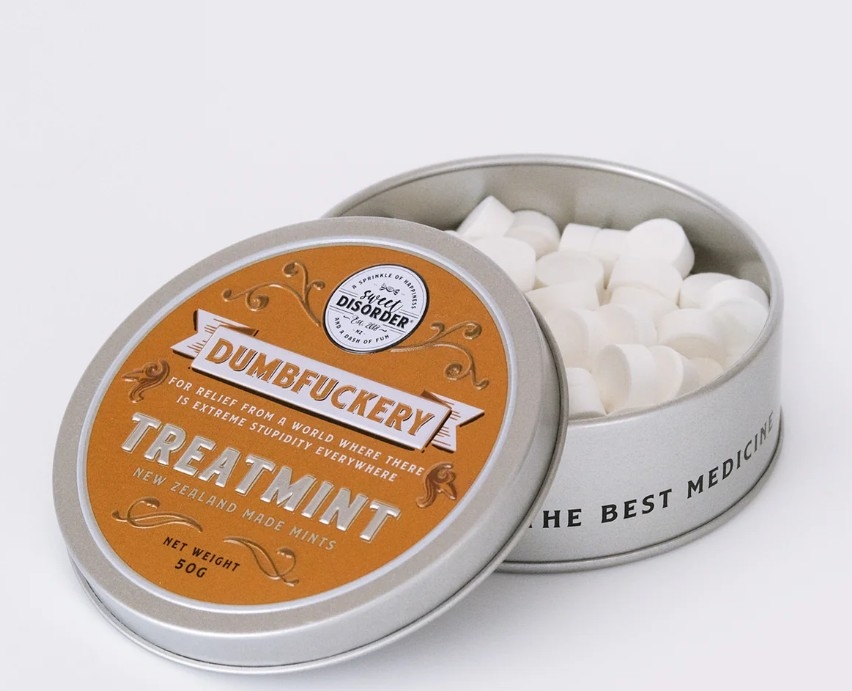 This quality embossed tin contains New Zealand made refreshing curiously strong mints.