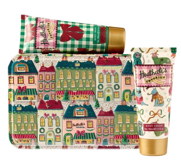 Welcome to Heathcote’s Emporium inspired by Christmas shopping. Body wash decorated with hand painted red bows and Christmas gingham sits alongside the body cream with festive cats and dogs dressed in favourite Christmas jumpers festooned with bows.