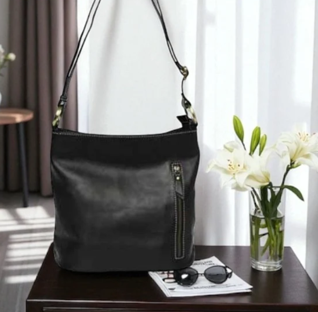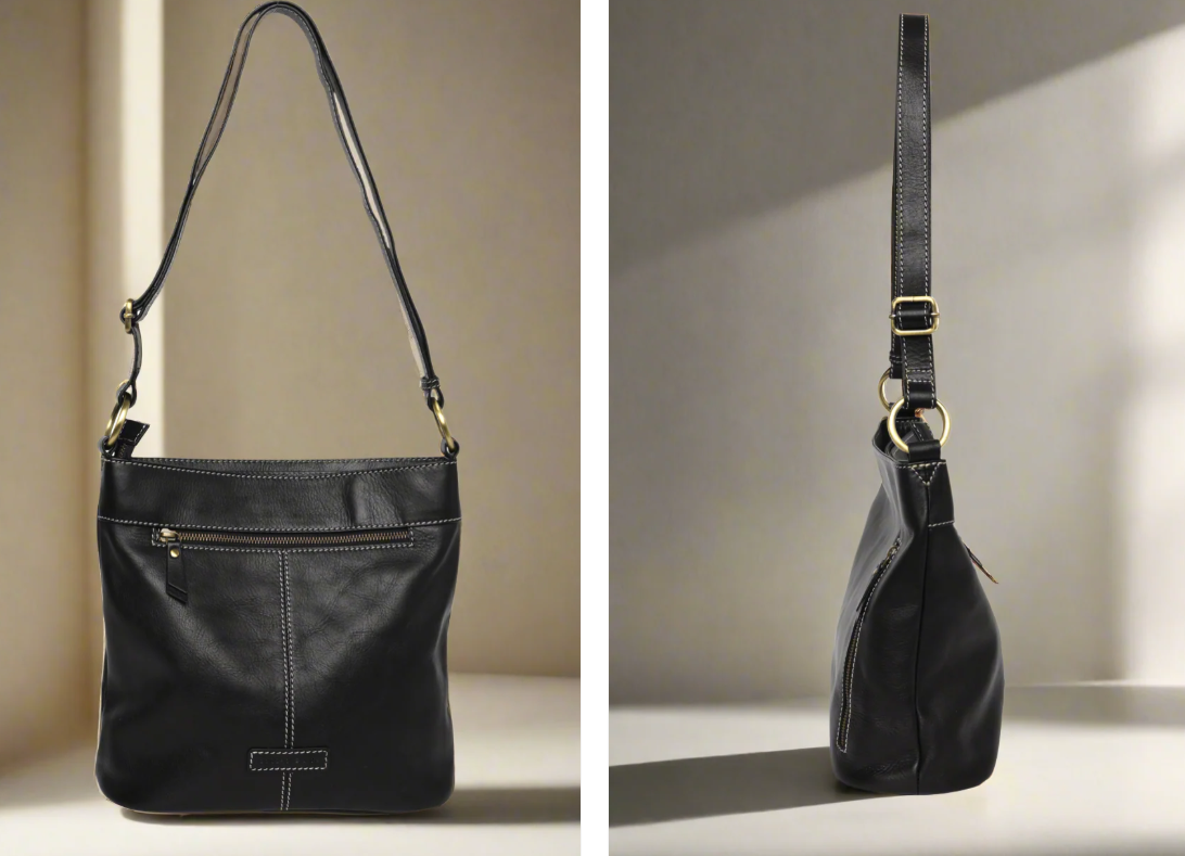 Signature shoulder bag - Chunky brass hardware Twin top sections Zip and magnetic closure Zips outside front & backAttractive heavy contrast stitch detail.