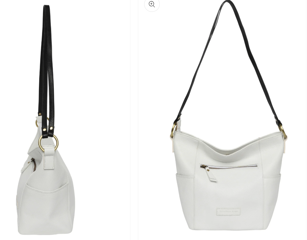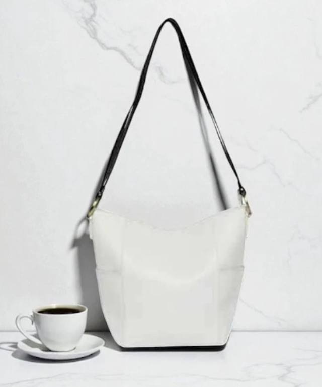 Classic bucket bag shape, attractive spaghetti shoulder straps. Two top sections with zip and magnetic closure, back outside zip , end pockets, metal feet.