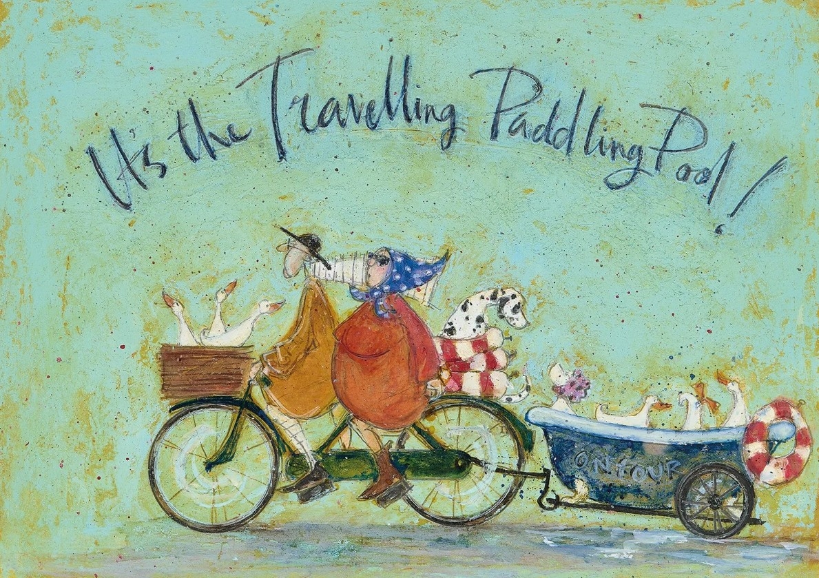 "It's the travelling paddling pool" by Sam Toft is an appealing artwork that captivates with its unique design. It features a vibrant depiction of ducks, a bicycle, and figures that convey a relaxed atmosphere. This print is an ideal element to add a personal touch to any room. 30 x 30 cm, it can be easily integrated into various interior styles and is suitable for both living spaces and offices. The design is officially licensed and reflects the creative signature of Sam Toft, known for her charming and humorous illustrations.white frame