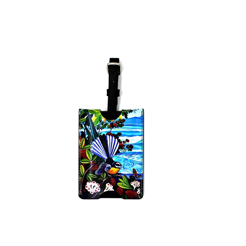 Leather Luggage Tag is printed on Fantail Birds on Coast artwork by NZ local artist Irina Velman