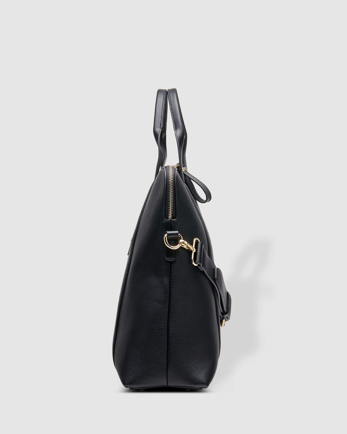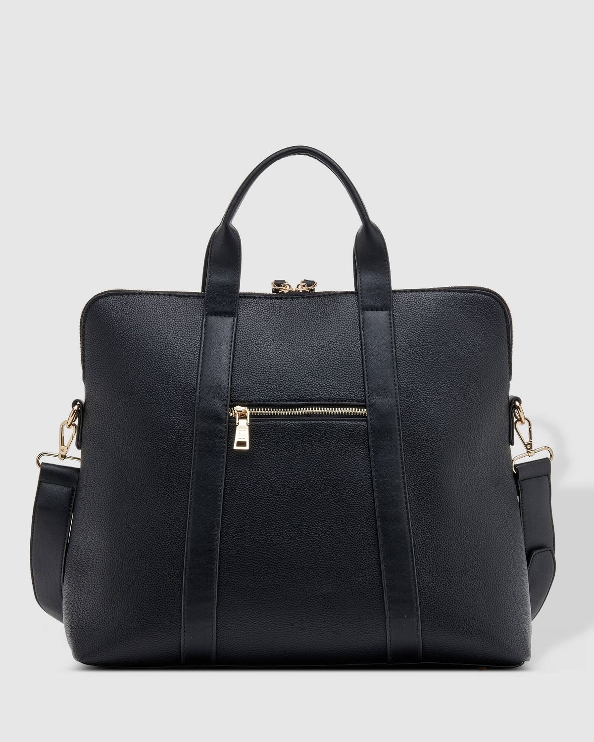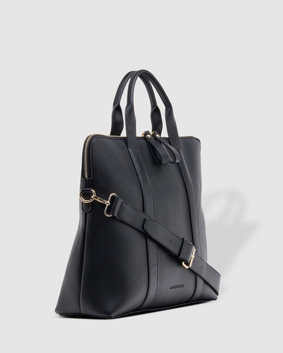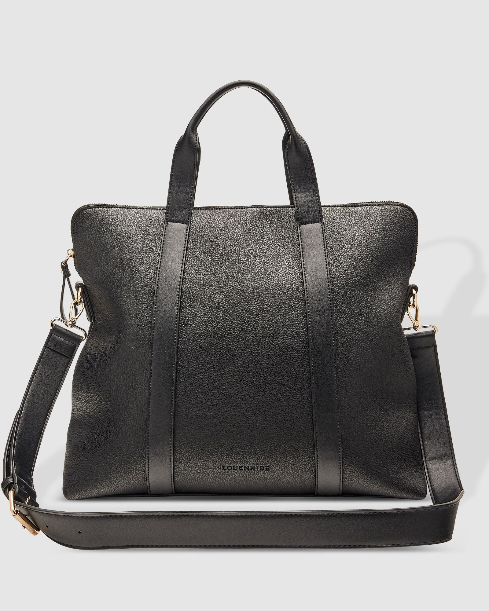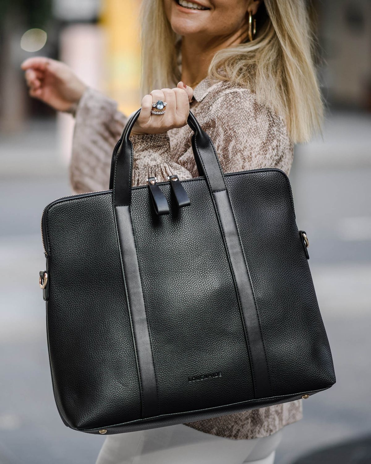 The Rhodes laptop bag is a classic. Season on season, this computer bag is a customer favourite. Invest in this practical and structured, quality vegan leather laptop bag, perfect for work, university or school. Spacious enough to fit up to a 15-inch laptop, with plenty of room for notebooks, pens, and books. Wear comfortably on your shoulder with the adjustable and detachable strap. Extra padding and multiple compartments will keep your laptop or tablet safe and protected. Internal features: 1 Phone Pocket, 1 Flat Pocket, 1 Zip Pocket, Padded flat pocket for laptop with velcro closure and middle wall divider.External features: Back Zip Pocket, Feet on BaseInternal lining: Black/White Stripe LiningStrap: Height 13cmExtension strap: Detachable Extension Strap (125cm)Closure: Secure ZipMaterial: Vegan LeatherHardware: Light Gold