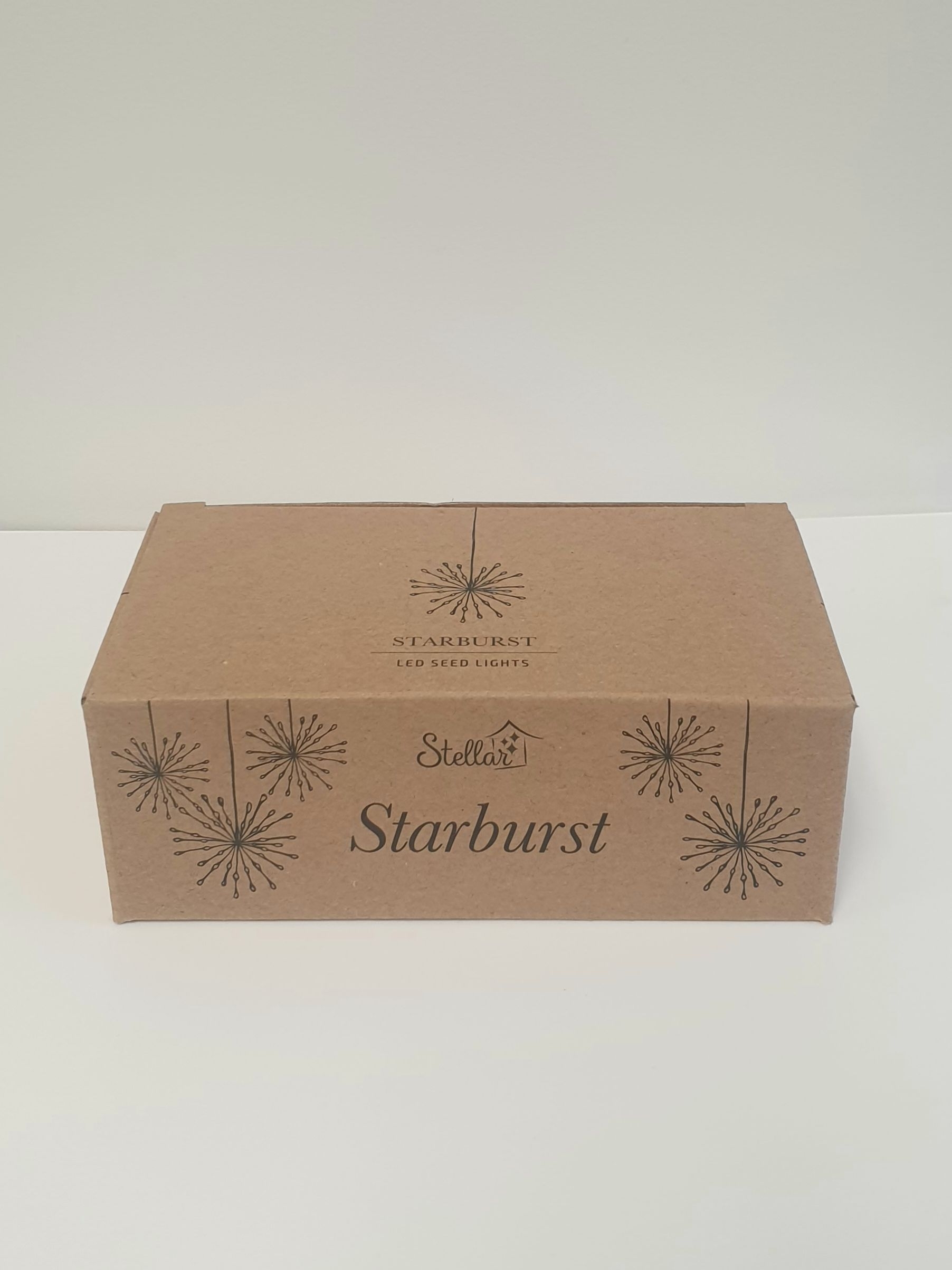The Starburst comes in a compact kraft box, with mains adapter.To display or use, simply take the unit out of the box, hold the case/adapter firmly, and straighten out each strand.The quickest way to get it all splayed evenly is to work with one strand at a time, twisting the LEDs one a a time.Start with the LED closest to the centre and work your way out to the ends. Keep hold of the centre case or adapter the whole time.
